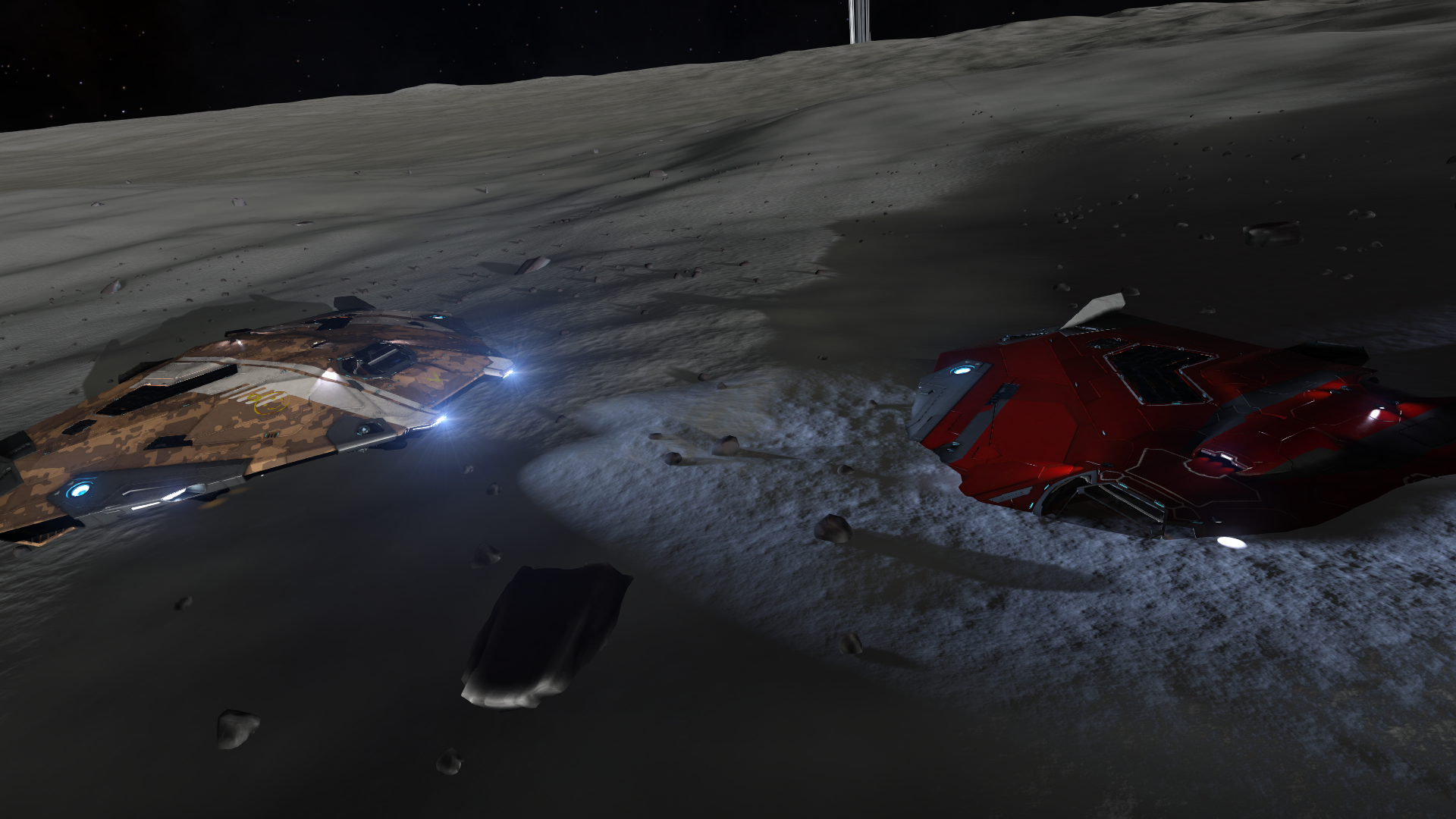 Danach ging es behutsam an den Scarab. Das gestaltete sich sehr holprig, im wahrsten Sinne des Wortes. Fahrschule erste Fahrstunde. Sitzposition einstellen, Spiegel justieren, Instrumente erkunden, Gas und Bremse, Scheibenwischer und Nebelscheinwerfer…irgendwann klappte es dann, sie kam sogar zurück an Bord Ihres Schiffes. Nachdem wir dann wieder abgehoben sind, ging es zurück zur Basis. Dort wartete dann Xaar an den Dockingplätzen. Nach Auswertung der Telemetrie hatte dann auch Xaar sein Entertainment des Abends. Morgen werden wir dann die Kampffähigkeiten des Schiffs testen bzw. vielmehr Ihr helfen, sich an das neue Schiff zu gewöhnen.